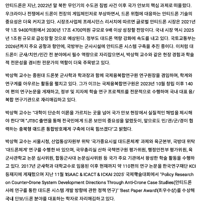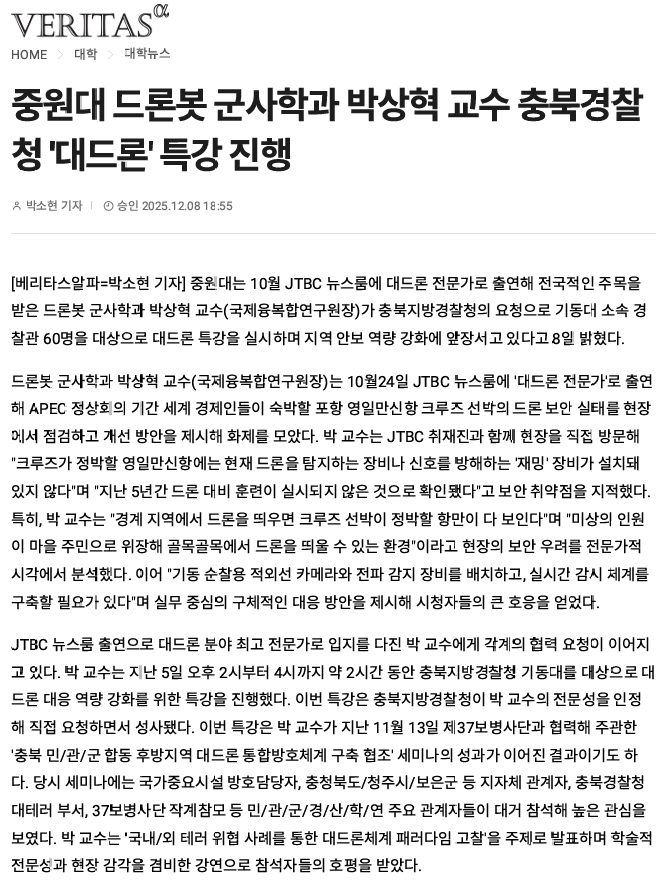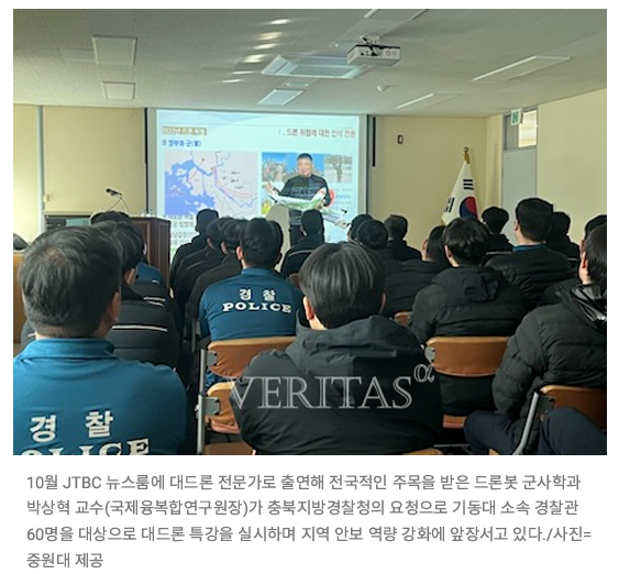 원대 드론봇 군사학과 박상혁 교수 충북경찰청 '대드론' 특강 진행 관리자 입력 2025-12-09 19:07 읽음 1,453 목록 이전글국제융복합연구원(원장, 박상혁 교수) '제8회 동계학술 세미나' 개최 25.12.09 다음글제8회, 국제융복합연구원 동계 학술 세미나 25.12.07 댓글 0 댓글목록 등록된 댓글이 없습니다.