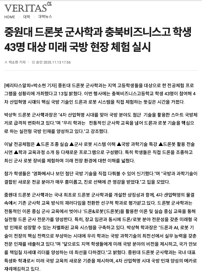 충북 비즈니스 고등학생 43명_드론봇 군사학과 전공 체험 실시 관리자 입력 2025-11-14 12:04 읽음 467 목록 이전글#2. 언론보도_국제학술대회, 대드론 논문 최우수상(Best Award Paper) 25.11.24 다음글드론봇 군사학과_첨단 국방 인재 양성 지역 안보 협력 선도 25.11.14 댓글 0 댓글목록 등록된 댓글이 없습니다.