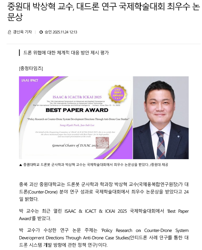 #1. 언론보도_국제학술대회, 대드론 논문 최우수상(Best Award Paper)