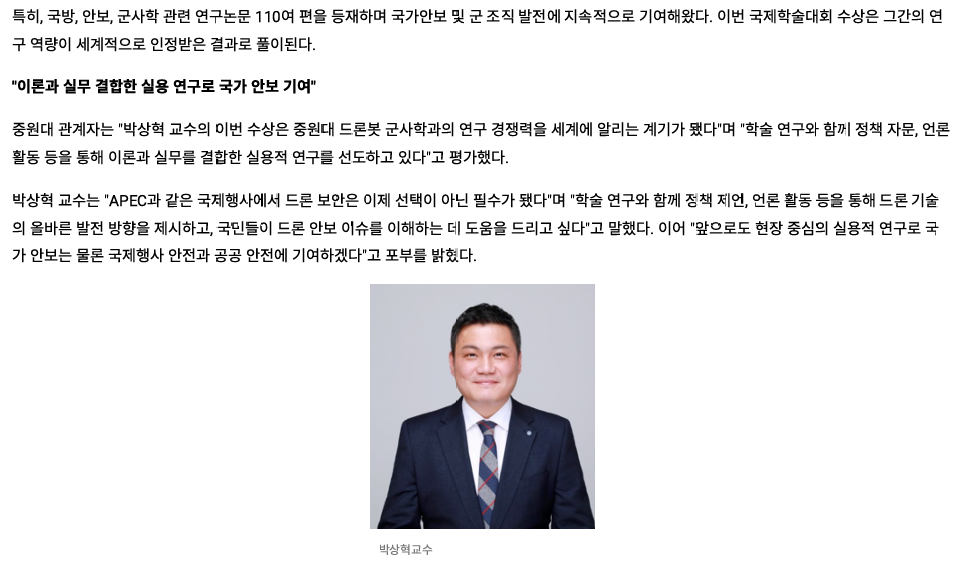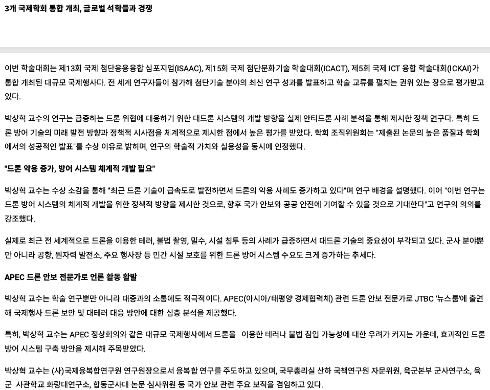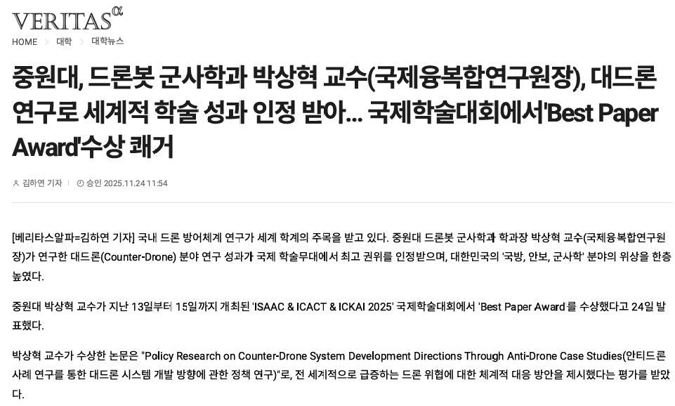 #2. 언론보도_국제학술대회, 대드론 논문 최우수상(Best Award Paper) 관리자 입력 2025-11-24 17:26 읽음 134 목록 이전글#1. 언론보도_국제학술대회, 대드론 논문 최우수상(Best Award Paper) 25.11.24 다음글충북 비즈니스 고등학생 43명_드론봇 군사학과 전공 체험 실시 25.11.14 댓글 0 댓글목록 등록된 댓글이 없습니다.