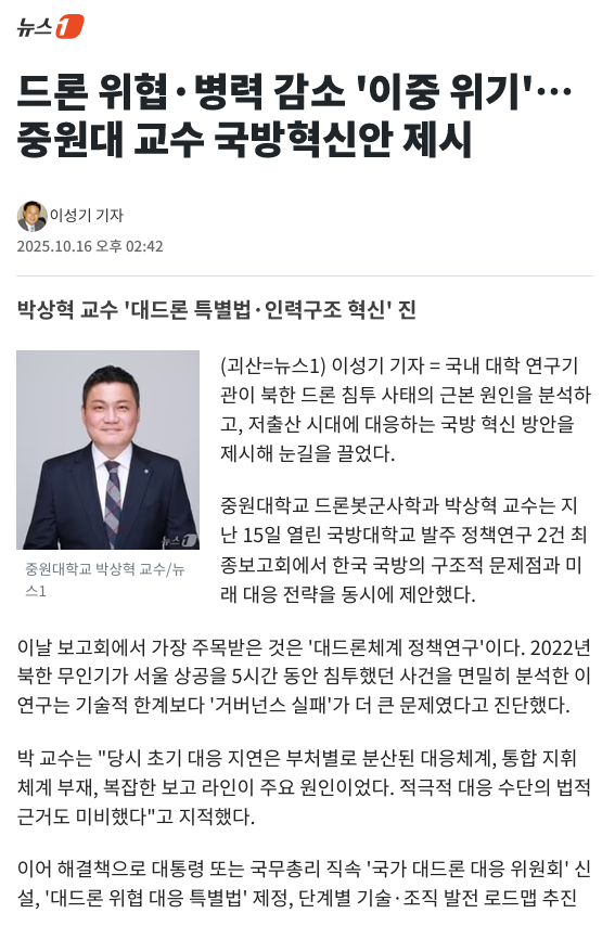 #2. 언론보도_박상혁 학과장_국방대학교 '대드론' 연구과제 최종 발표 관리자 입력 2025-10-17 10:17 읽음 1,260 목록 이전글#1. 언론보도_박상혁 학과장_국방대학교 '대드론' 연구과제 최종 발표 25.10.17 다음글육군교육사령부_황장일 대령님 특강 25.10.13 댓글 0 댓글목록 등록된 댓글이 없습니다.